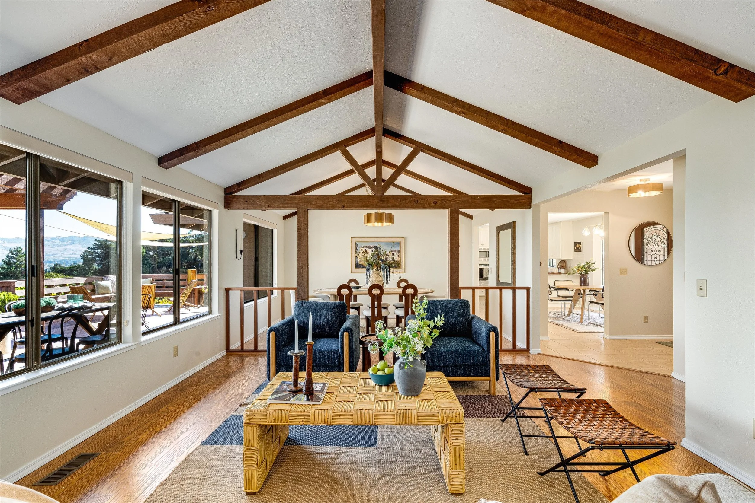 The residence spans 2390 square feet, boasting an open-beam, peaked ceiling over the formal dining and living rooms. Exposed wood beams add a handsome touch of drama, while large windows allow for views while you dine and entertain. An open concept, sunny breakfast & kitchen blended area is designed for less formal everyday gatherings. Stainless steel appliances are throughout. Sit and enjoy a meal at the table or pull up a seat at the counter to chat with the chef.