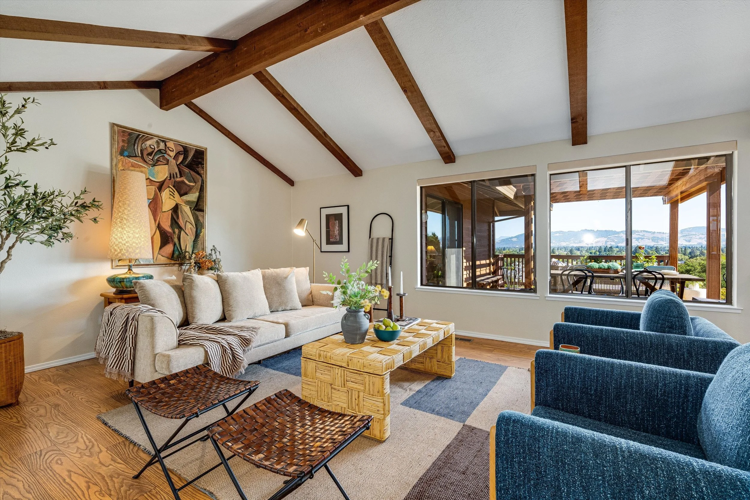 Experience peace & tranquility in this handsome ranchette home that sits on 2.03 acres, ready for you to move in & enjoy. Tucked away up a private driveway, up the hill from the road, this charming single-level house allows for gatherings of friends and family, or relaxing everyday living. Nicely maintained, the home blends comfortable enjoyment with sweeping views of your acreage and the distant Sonoma mountains.